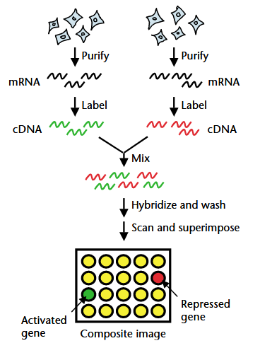 - Labeled cDNA is hybridized to a chip with complementary DNA probes a specific locations on the chip