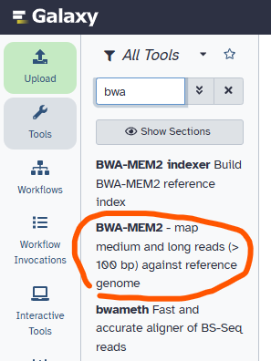 Open the BWA-MEM2 tool in Galaxy and select the following as inputs: