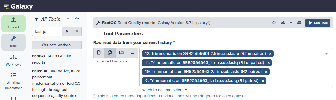We now have 4 files to run. Select the multiple datasets option for the input field and select the output files from Trimmomatic.