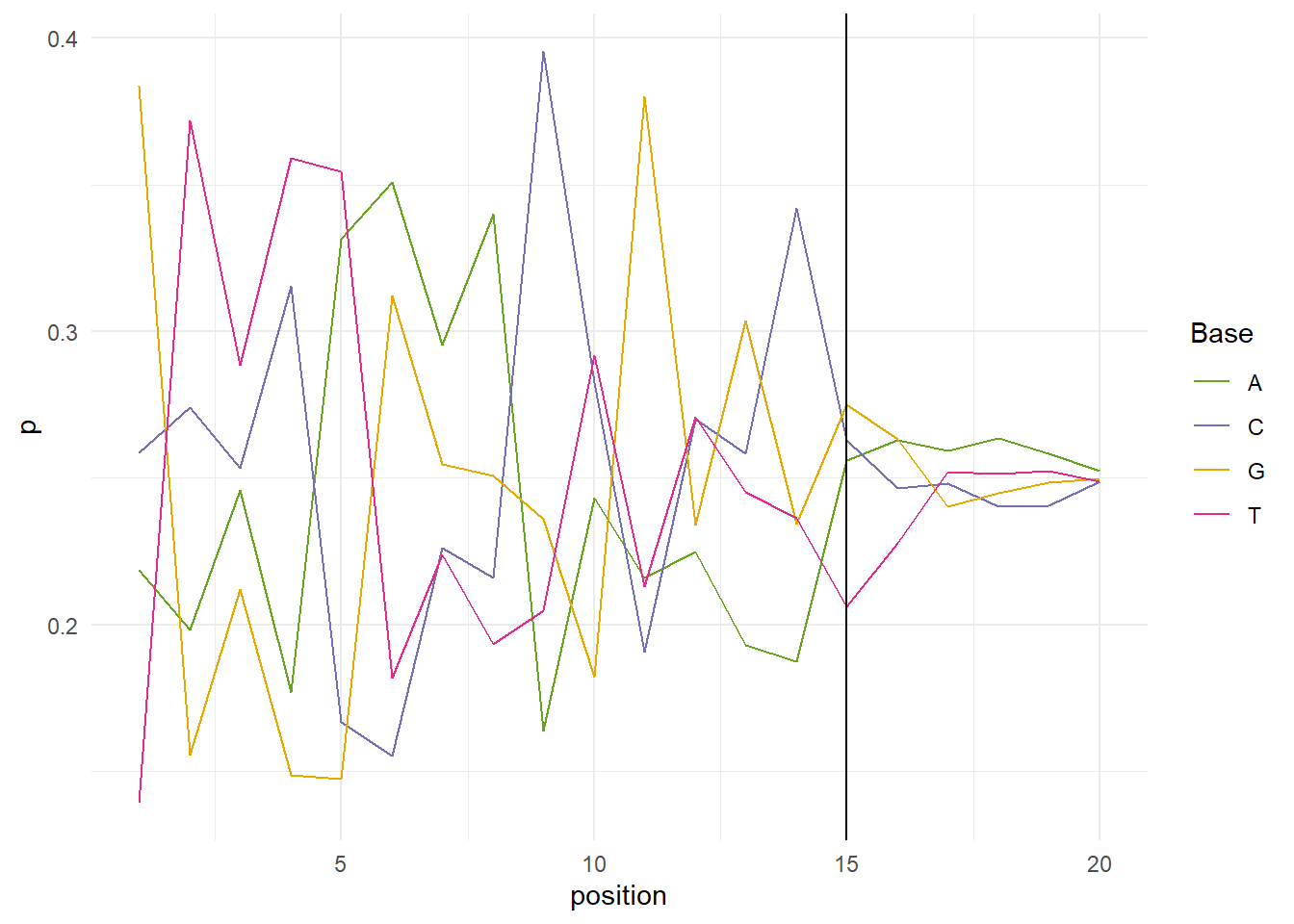 library(ShortRead) # install with BiocManager::install("ShortRead")library(stringr)library(tidyr)library(ggplot2)library(RColorBrewer)root <- here::here()# read sequencesreads <-readFastq(file.path(root, 'data', 'ngs', 'SRR2584863_1.trim.sub.fastq')) |>sread()# split out nucleotides in the first 20 positionsnbp <-20bp_by_pos <-subseq(reads, start =1, end = nbp) |>as.character() |>str_split('') |>unlist() |>matrix(ncol = nbp, byrow =TRUE)# set up our own per base sequence content plotpb <-tibble(position =1:nbp,A =apply(bp_by_pos =='A', 2, mean),C =apply(bp_by_pos =='C', 2, mean),`T`=apply(bp_by_pos =='T', 2, mean),G =apply(bp_by_pos =='G', 2, mean)) |>pivot_longer(cols =2:5, names_to ='Base', values_to ='p')ggplot(pb, aes(position, p, color = Base)) +geom_line() +theme_minimal() +geom_vline(xintercept =15) +scale_color_manual(values =brewer.pal(n =7, name ='Dark2')[c(5,3,6,4)])