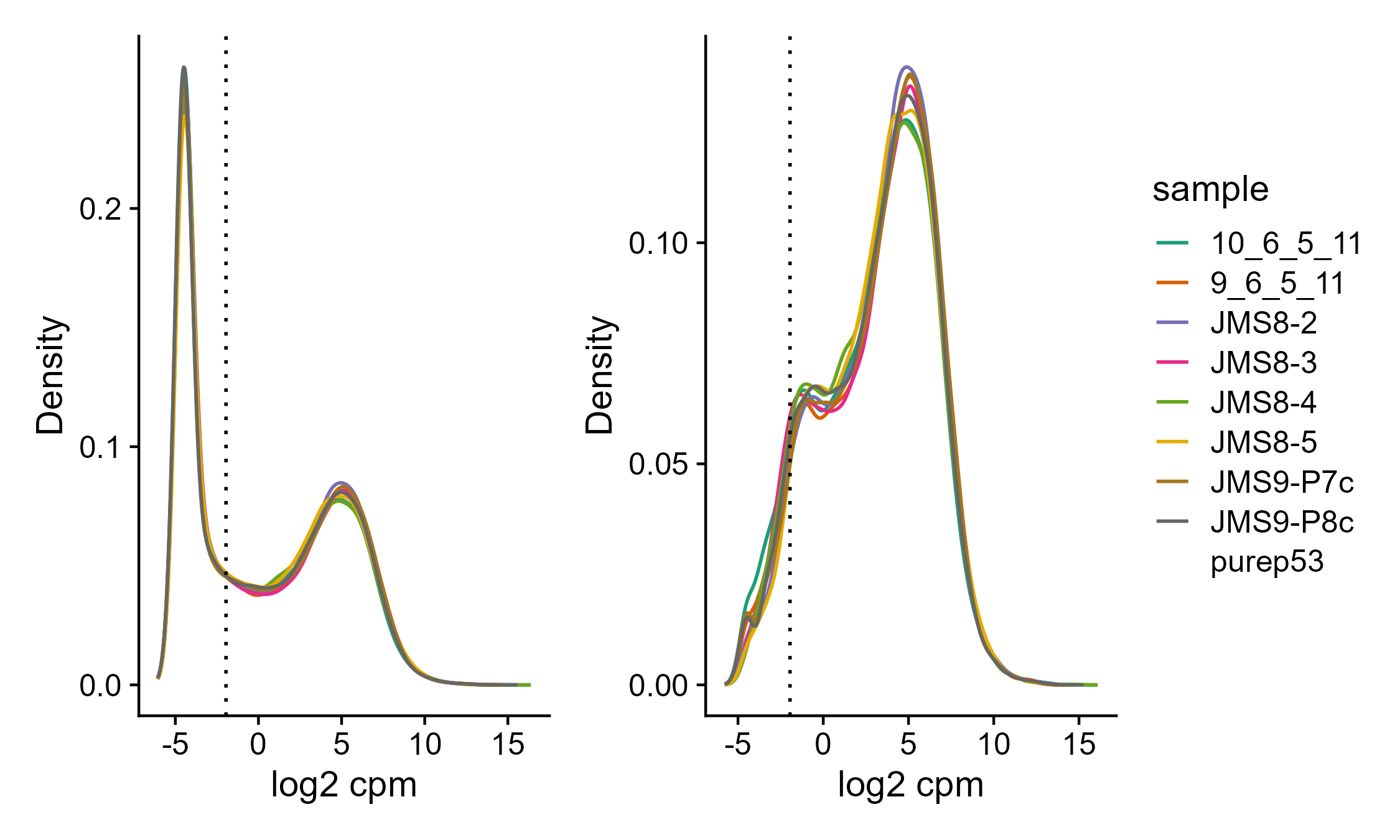 lcpm.cutoff <- log2(10/(mean(counts_raw$samples$lib.size) * 1e-6) +
