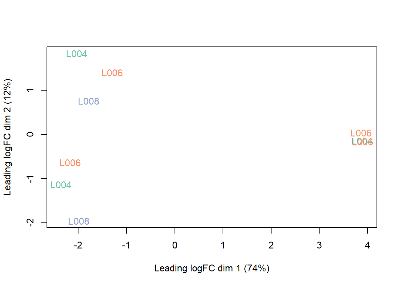 glMDSPlot(lcpm, labels=paste(counts$samples$group,