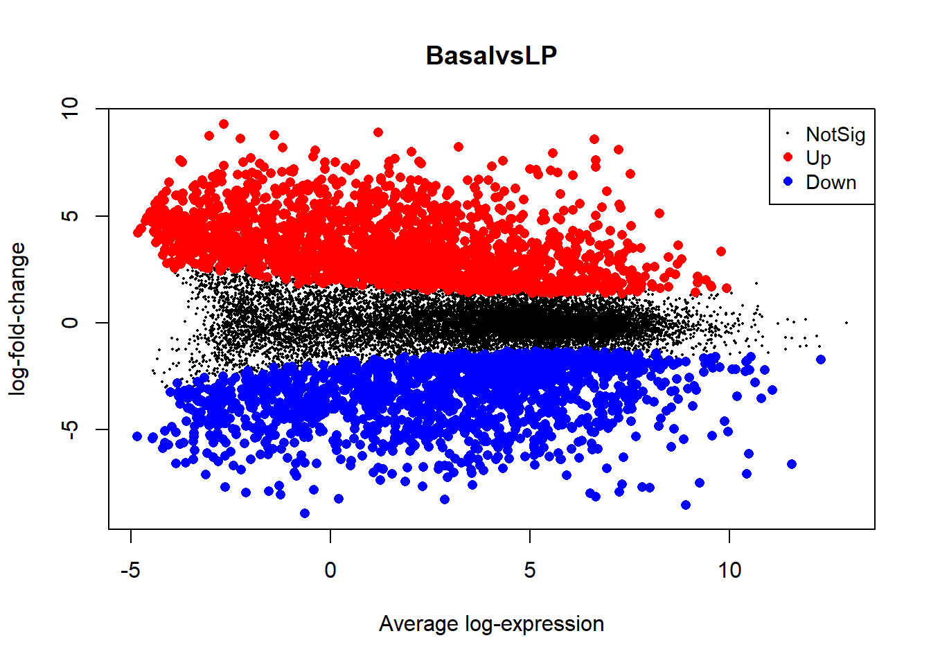 We can also visually inspect the Basal vs LP results with plotMD. This will generate a static plot of the up and down regulated genes in a comparison between the two groups.