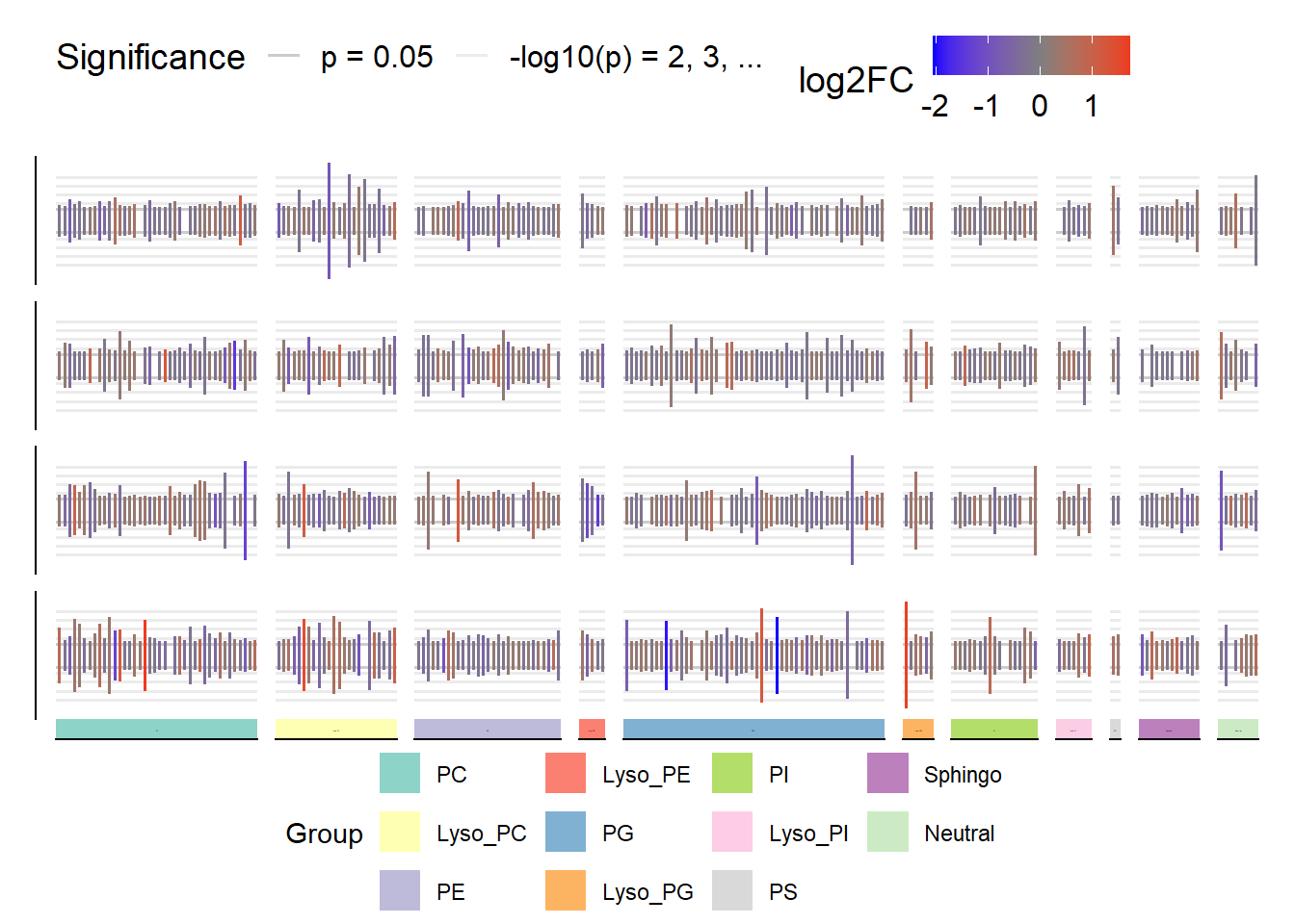 matrix_barplot(metlip, aes(x = Lipid, y = neg_log_p, color = log2FC),